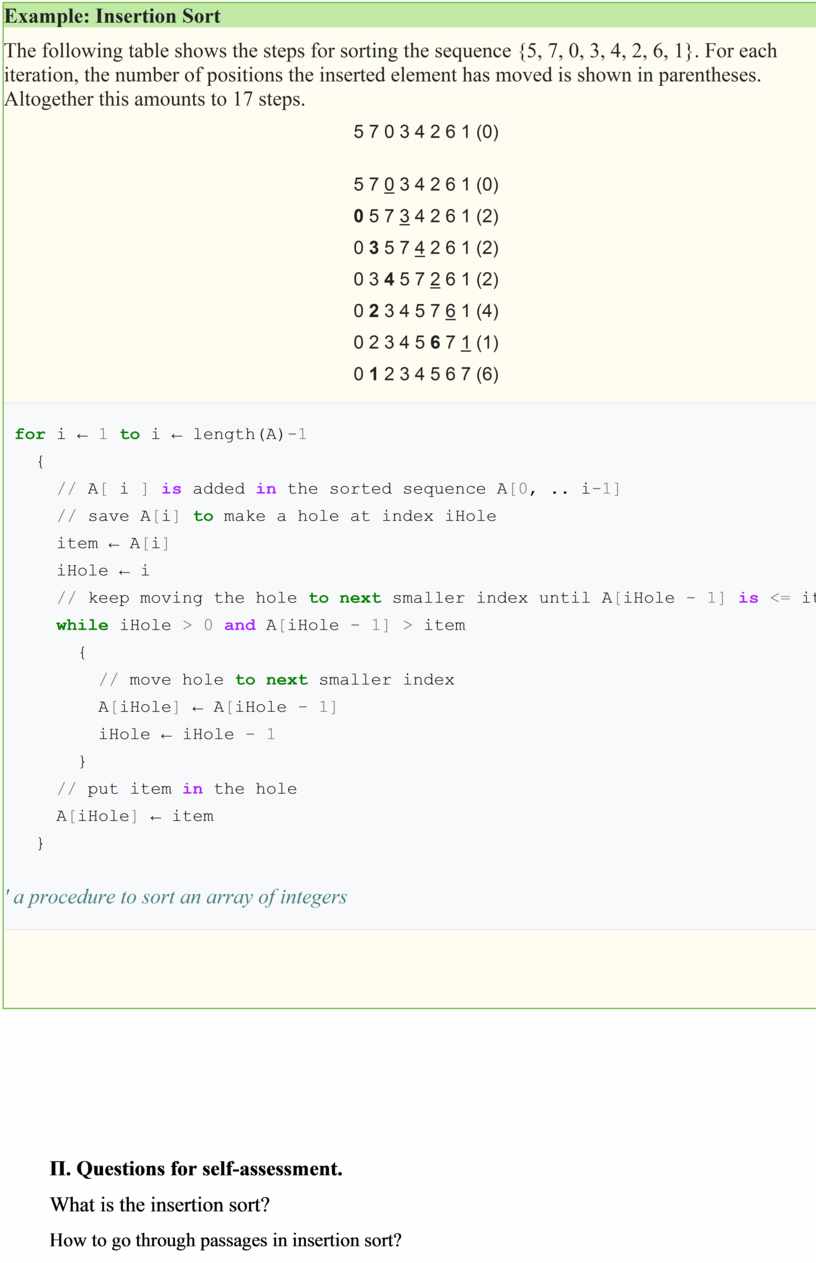 Example: Insertion Sort The following table shows the steps for sorting the sequence {5, 7, 0, 3, 4, 2, 6, 1}. For each iteration, the number of positions the inserted element has moved is shown in parentheses. Altogether this amounts to 17 steps. 5 7 0 3 4 2 6 1 (0)