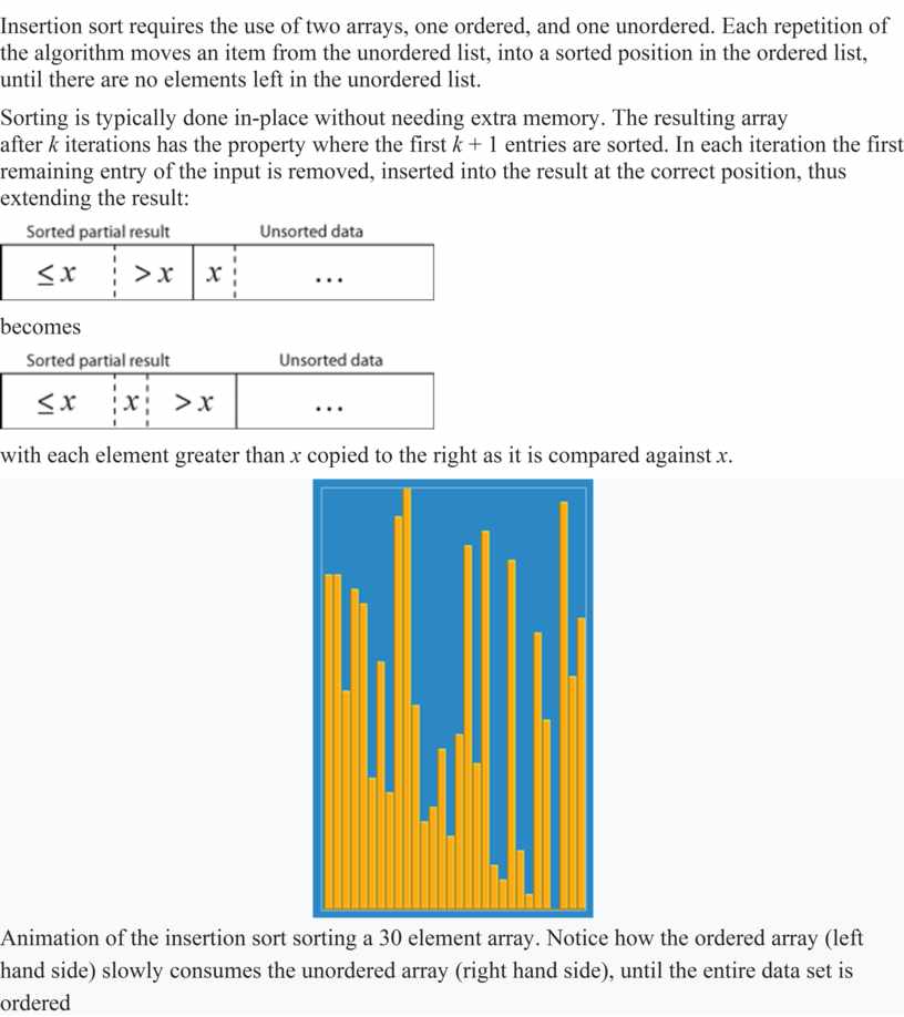 Insertion sort is a simple sorting algorithm: a comparison sort in which the sorted array (or list) is built one entry at a time. It is much less efficient on large lists than more advanced algorithms such as quicksort, heapsort, or merge sort and you may cover these at university. However, insertion sort provides several advantages: