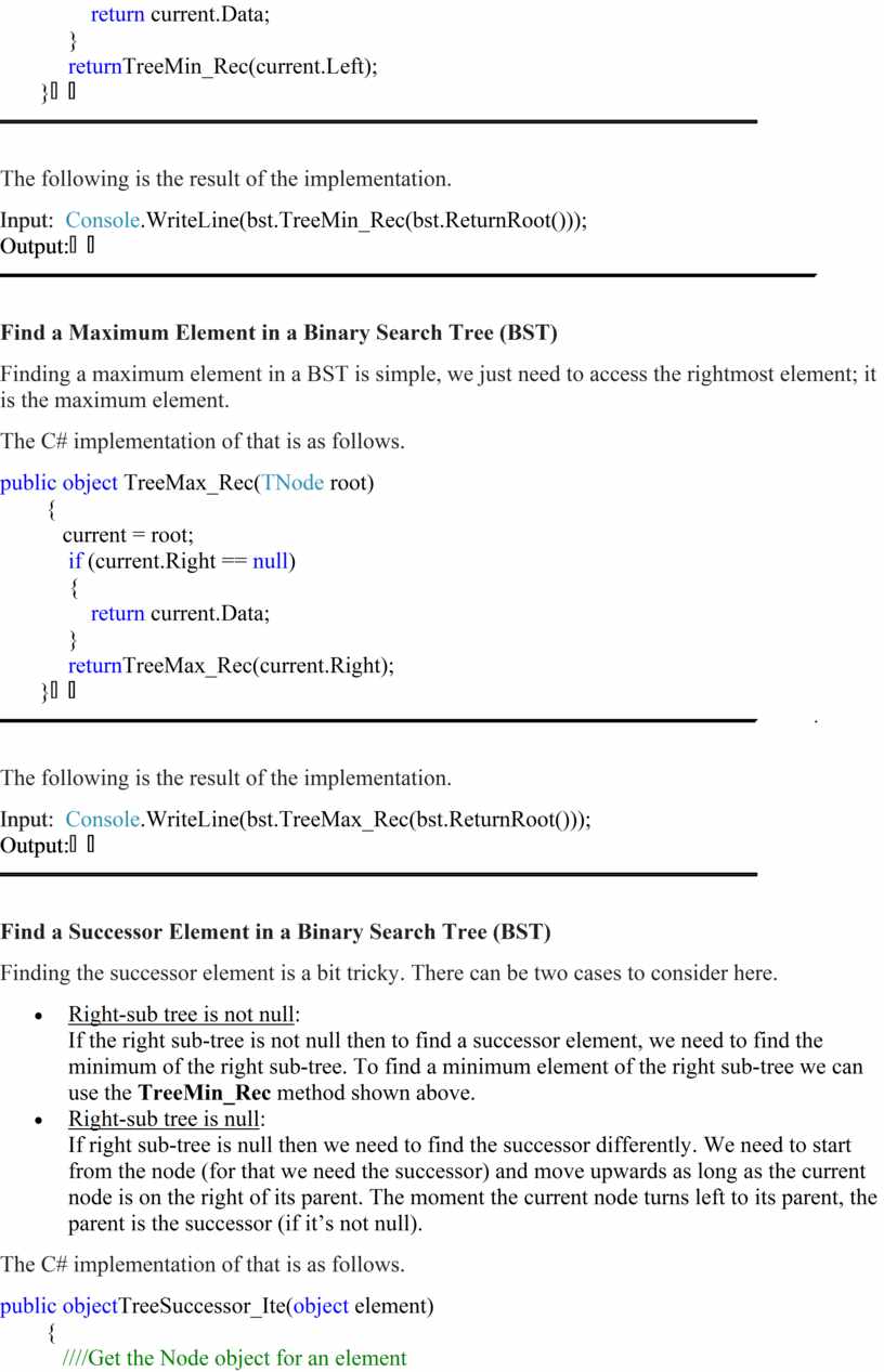 If the right sub-tree is not null then to find a successor element, we need to find the minimum of the right sub-tree. To find a minimum element of the right sub-tree we can use the TreeMin_Rec method shown above.