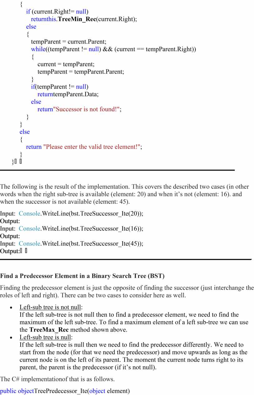 public objectTreePredecessor_Ite(object element) { ////Get the Node object for an element current = this.GetNode(element); if (current != null) { if (current.Left != null) return this.TreeMax_Rec(current.Left); else { tempParent = current.Parent; while((tempParent != null) && (current == tempParent.Left)) { current = tempParent; tempParent = tempParent.Parent; } if(tempParent != null) returntempParent.Data; else return"Predecessor is not found!"; } } else { return "Please enter the valid tree element!"; } } |
