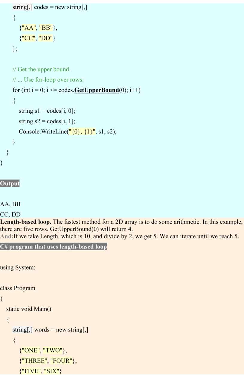 C# program that uses GetUpperBound using System; class Program{ static void Main() { string[,] codes = new string[,] { {"AA", "BB"}, {"CC", "DD"} }; // Get the upper bound. // ... Use for-loop over rows.for (int i = 0; i <= codes.GetUpperBound(0); i++)
