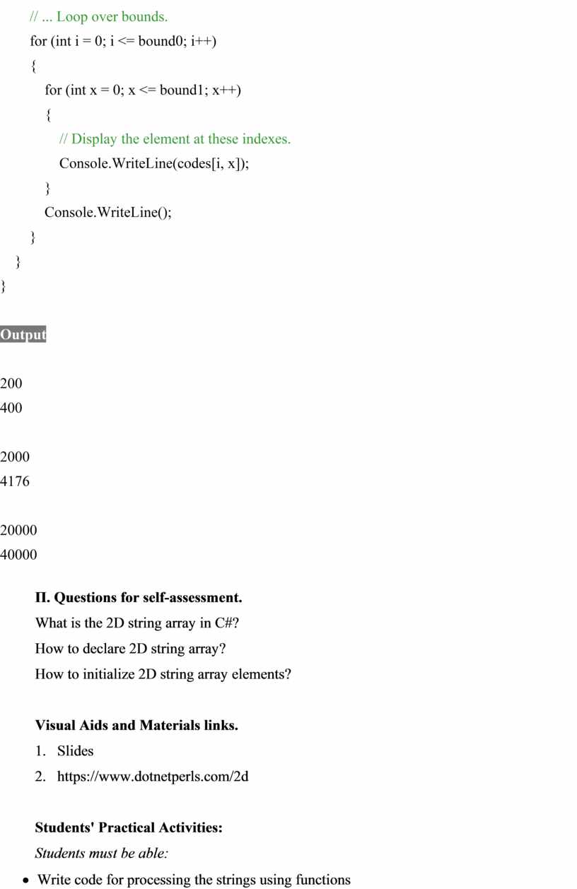For instance, for loop operator is used to work with 2D string array elements.