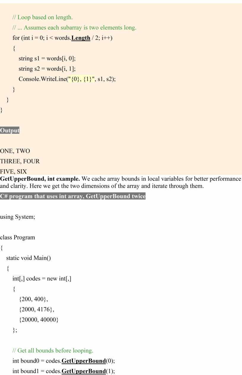 C# program that uses int array, GetUpperBound twice using System; class Program{ static void Main() { int[,] codes = new int[,] { {200, 400}, {2000, 4176}, {20000, 40000} }; // Get all bounds before looping.int bound0 = codes.GetUpperBound(0);