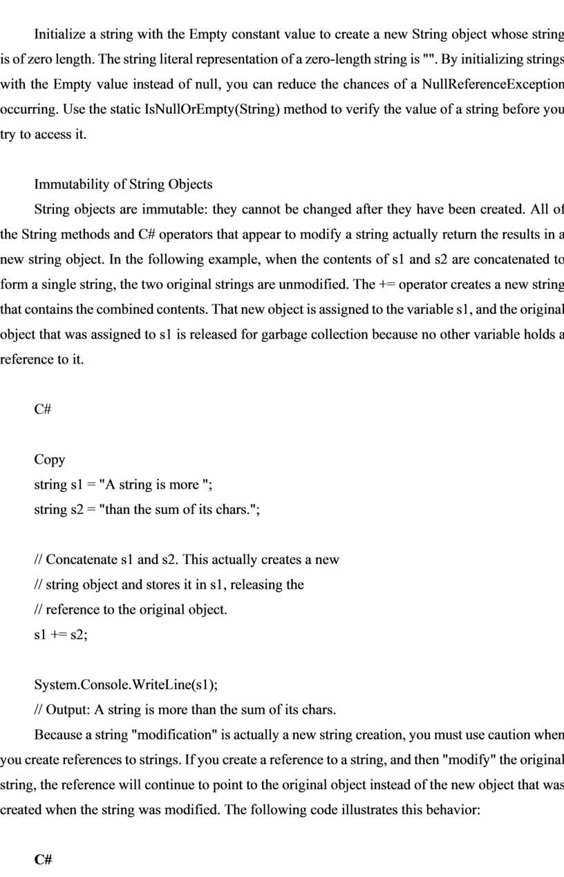 String objects are immutable: they cannot be changed after they have been created. All of the String methods and C# operators that appear to modify a string actually return the results in a new string object. In the following example, when the contents of s1 and s2 are concatenated to form a single string, the two original strings are unmodified. The += operator creates a new string that contains the combined contents. That new object is assigned to the variable s1, and the original object that was assigned to s1 is released for garbage collection because no other variable holds a reference to it.