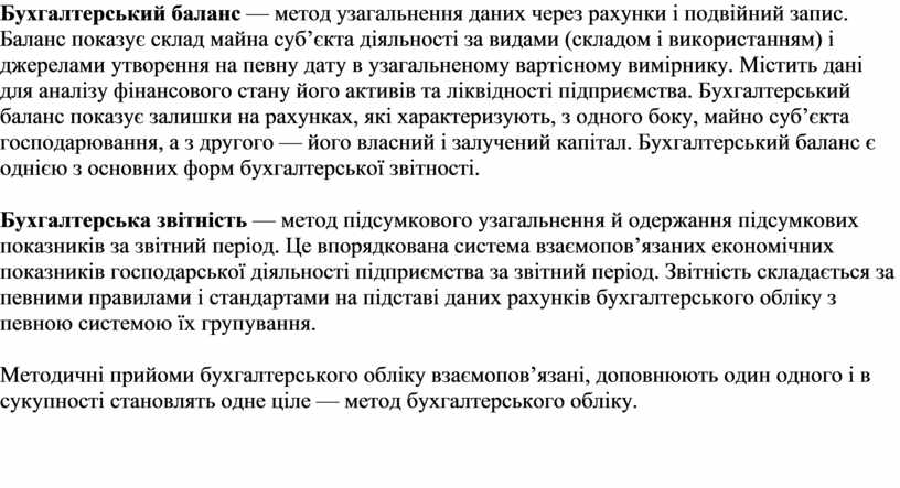 Бухгалтерський баланс — метод узагальнення даних через рахунки і подвійний запис. Баланс показує склад майна суб’єкта діяльності за видами (складом і використанням) і джерелами утворення на певну дату в узагальненому вартісному вимірнику. Містить дані для аналізу фінансового стану його активів та ліквідності підприємства. Бухгалтерський баланс показує залишки на рахунках, які характеризують, з одного боку, майно суб’єкта господарювання, а з другого — його власний і залучений капітал. Бухгалтерський баланс є однією з основних форм бухгалтерської звітності.