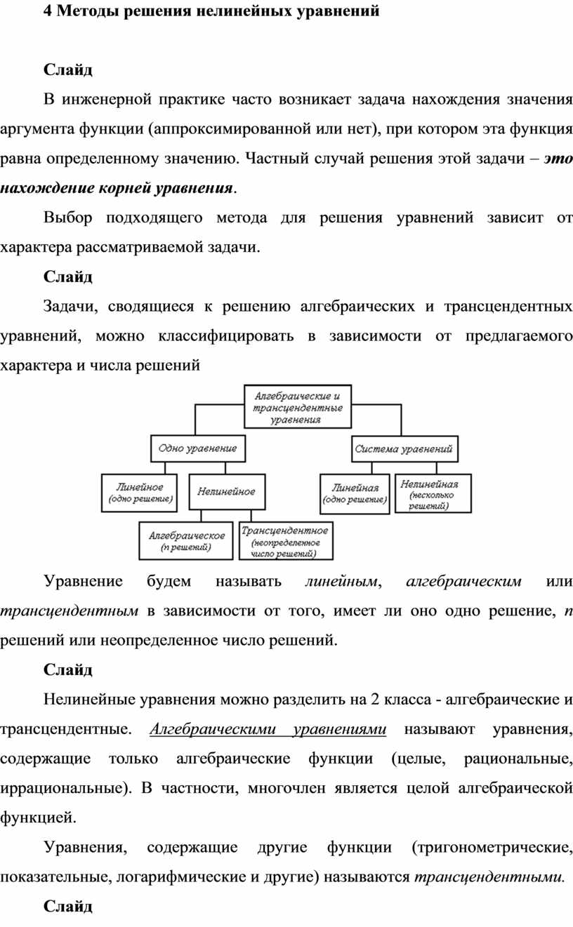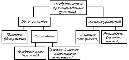 Нелинейные уравнения можно разделить на 2 класса - алгебраические и трансцендентные. Алгебраическими уравнениями называют уравнения, содержащие только алгебраические функции (целые, рациональные, иррациональные). В частности, многочлен является целой алгебраической функцией.