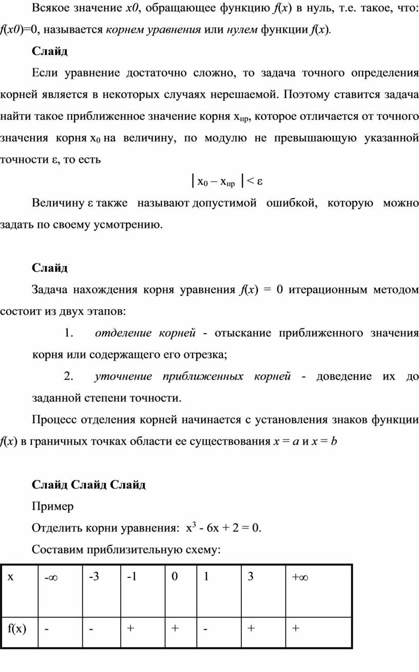 Если уравнение достаточно сложно, то задача точного определения корней является в некоторых случаях нерешаемой. Поэтому ставится задача найти такое приближенное значение корня xпр, которое отличается от точного значения корня x0 на величину, по модулю не превышающую указанной точности ε, то есть