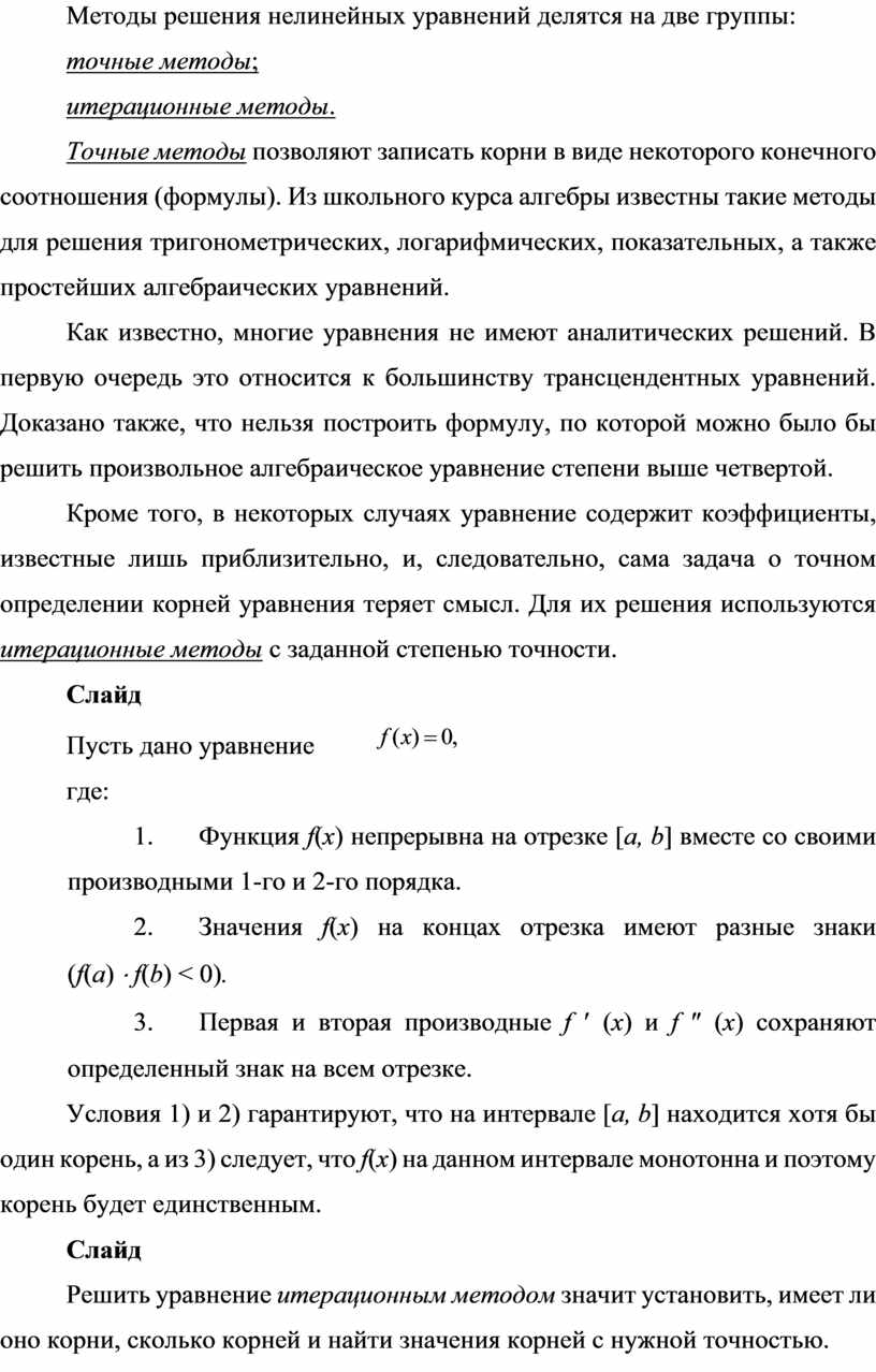 Решить уравнение итерационным методом значит установить, имеет ли оно корни, сколько корней и найти значения корней с нужной точностью.