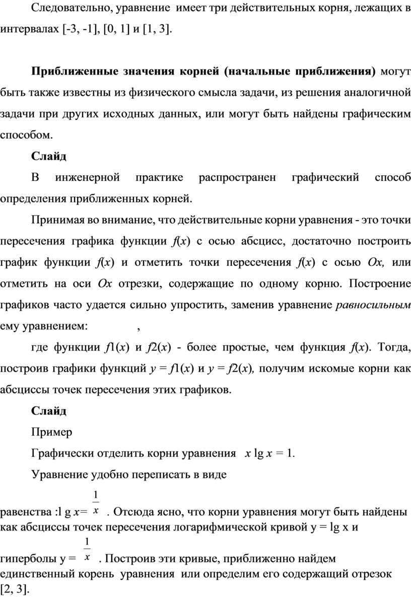 Приближенные значения корней (начальные приближения) могут быть также известны из физического смысла задачи, из решения аналогичной задачи при других исходных данных, или могут быть найдены графическим способом.