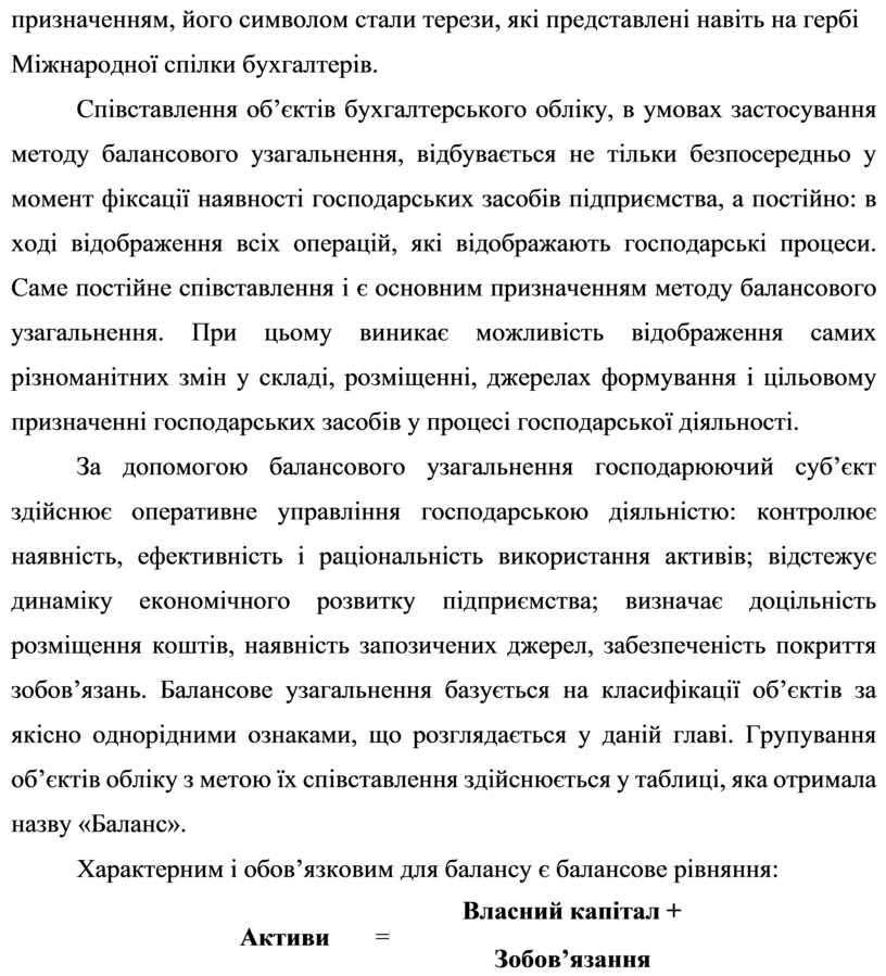 За допомогою балансового узагальнення господарюючий суб’єкт здійснює оперативне управління господарською діяльністю: контролює наявність, ефективність і раціональність використання активів; відстежує динаміку економічного розвитку підприємства; визначає доцільність розміщення коштів, наявність запозичених джерел, забезпеченість покриття зобов’язань. Балансове узагальнення базується на класифікації об’єктів за якісно однорідними ознаками, що розглядається у даній главі. Групування об’єктів обліку з метою їх співставлення здійснюється у таблиці, яка отримала назву «Баланс».