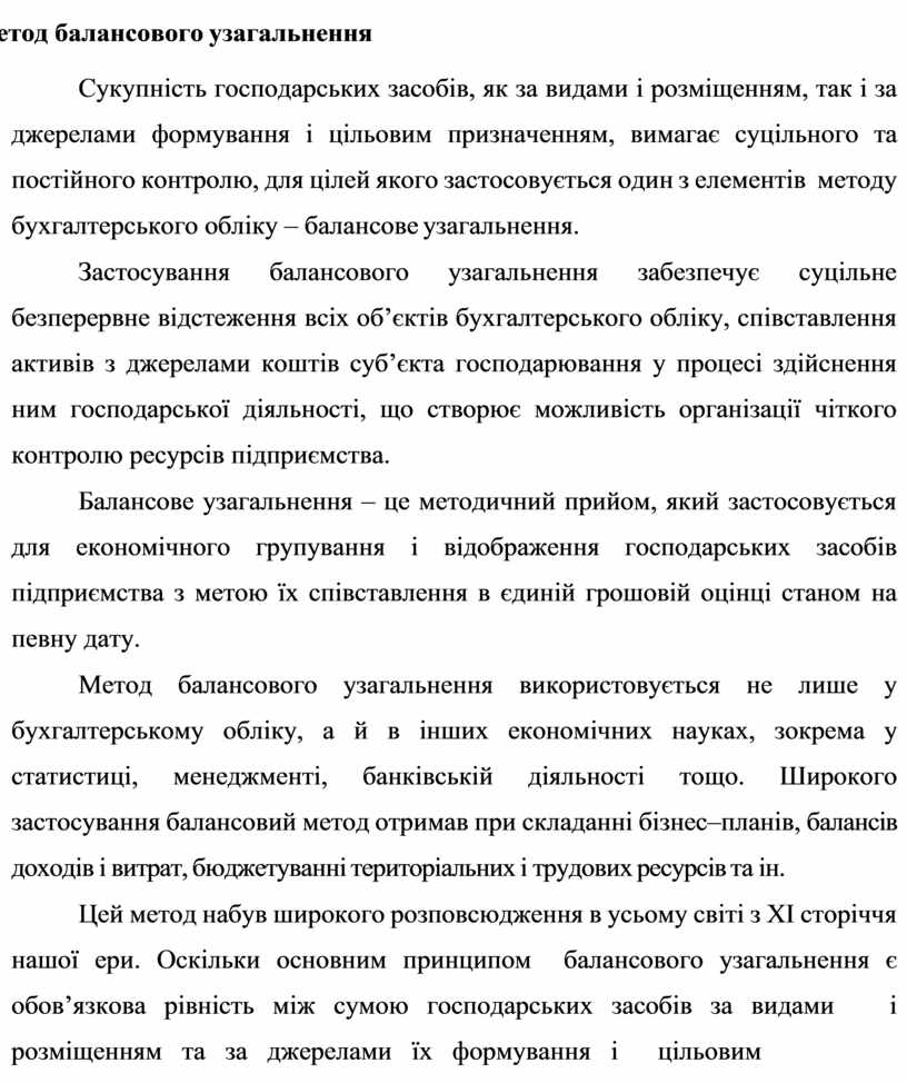 Сукупність господарських засобів, як за видами і розміщенням, так і за джерелами формування і цільовим призначенням, вимагає суцільного та постійного контролю, для цілей якого застосовується один з елементів методу бухгалтерського обліку – балансове узагальнення.