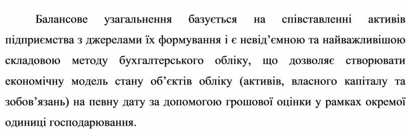 Балансове узагальнення базується на співставленні активів підприємства з джерелами їх формування і є невід’ємною та найважливішою складовою методу бухгалтерського обліку, що дозволяє створювати економічну модель стану об’єктів обліку (активів, власного капіталу та зобов’язань) на певну дату за допомогою грошової оцінки у рамках окремої одиниці господарювання.