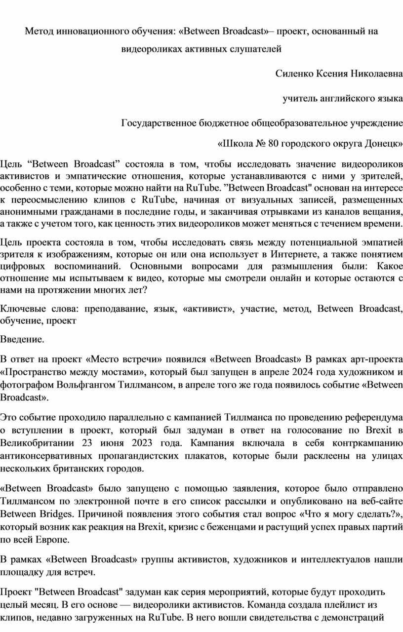 Метод инновационного обучения: «Between Broadcast»– проект, основанный на видеороликах активных слушателей