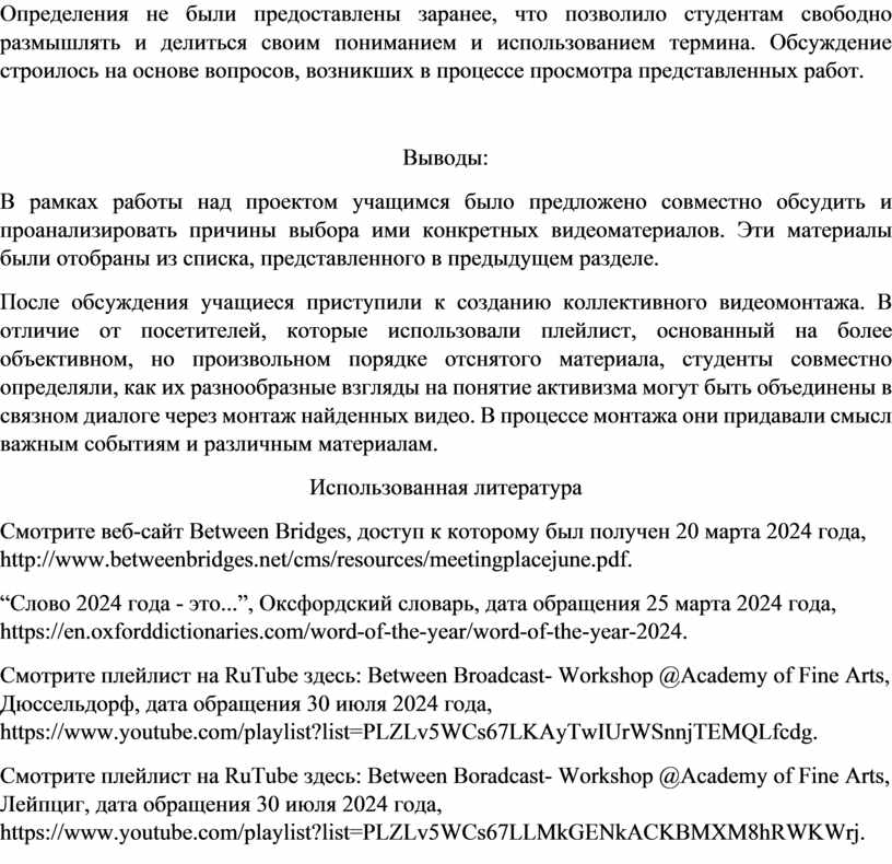 Смотрите плейлист на RuTube здесь: Between Boradcast- Workshop @Academy of Fine Arts, Лейпциг, дата обращения 30 июля 2024 года, https://www.youtube.com/playlist?list=PLZLv5WCs67LLMkGENkACKBMXM8hRWKWrj.