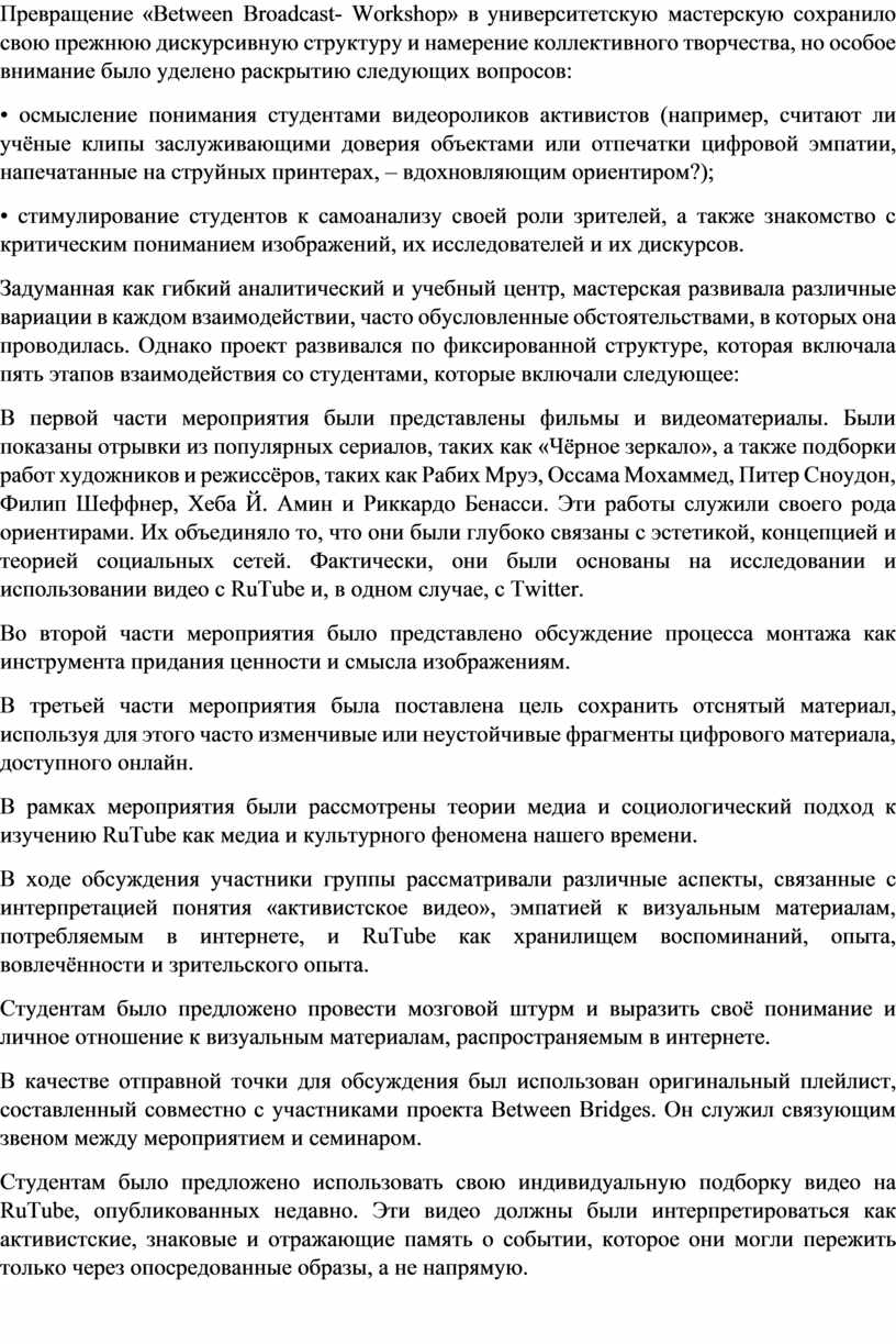 Превращение «Between Broadcast- Workshop» в университетскую мастерскую сохранило свою прежнюю дискурсивную структуру и намерение коллективного творчества, но особое внимание было уделено раскрытию следующих вопросов: