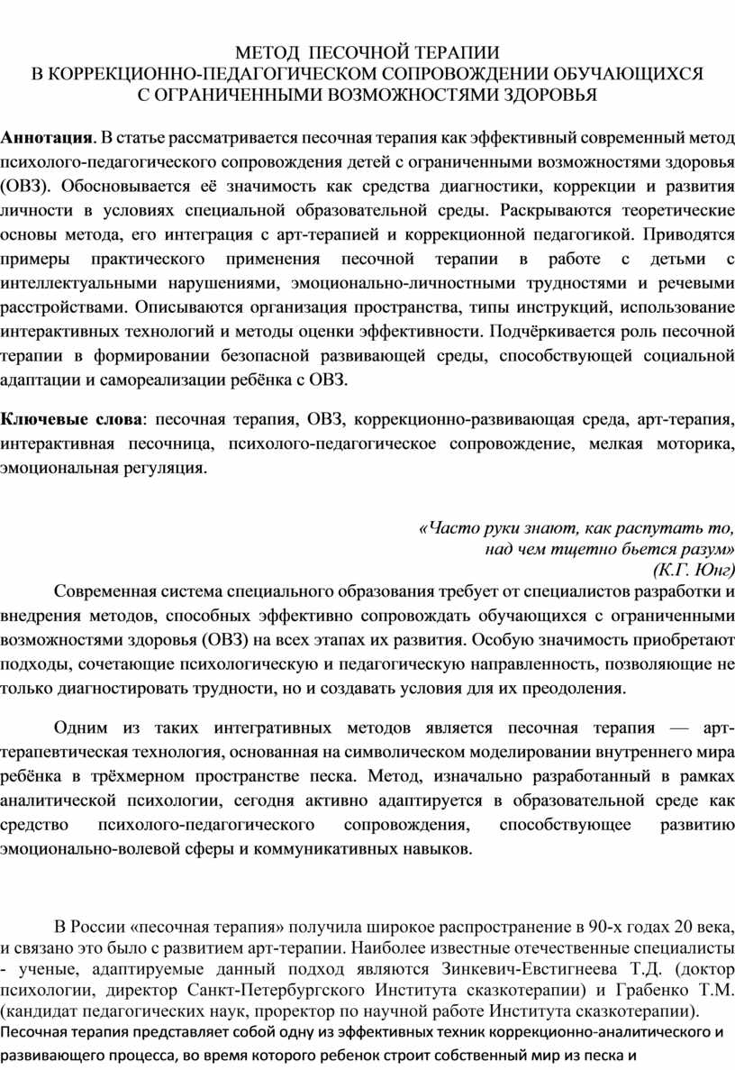 Аннотация. В статье рассматривается песочная терапия как эффективный современный метод психолого-педагогического сопровождения детей с ограниченными возможностями здоровья (ОВЗ). Обосновывается её значимость как средства диагностики, коррекции и развития личности в условиях специальной образовательной среды. Раскрываются теоретические основы метода, его интеграция с арт-терапией и коррекционной педагогикой. Приводятся примеры практического применения песочной терапии в работе с детьми с интеллектуальными нарушениями, эмоционально-личностными трудностями и речевыми расстройствами. Описываются организация пространства, типы инструкций, использование интерактивных технологий и методы оценки эффективности. Подчёркивается роль песочной терапии в формировании безопасной развивающей среды, способствующей социальной адаптации и самореализации ребёнка с ОВЗ.