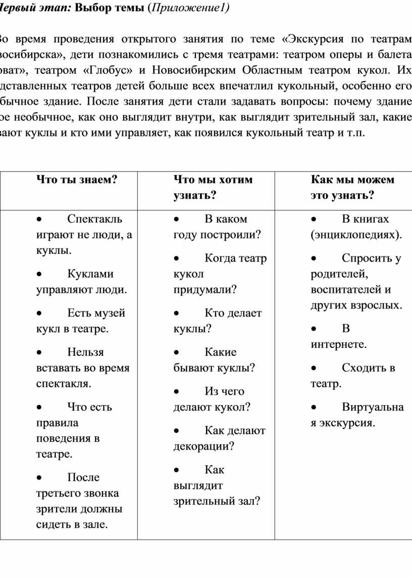 Во время проведения открытого занятия по теме «Экскурсия по театрам Новосибирска», дети познакомились с тремя театрами: театром оперы и балета «Новат», театром «Глобус» и Новосибирским Областным театром кукол. Их представленных театров детей больше всех впечатлил кукольный, особенно его необычное здание. После занятия дети стали задавать вопросы: почему здание такое необычное, как оно выглядит внутри, как выглядит зрительный зал, какие бывают куклы и кто ими управляет, как появился кукольный театр и т.п.