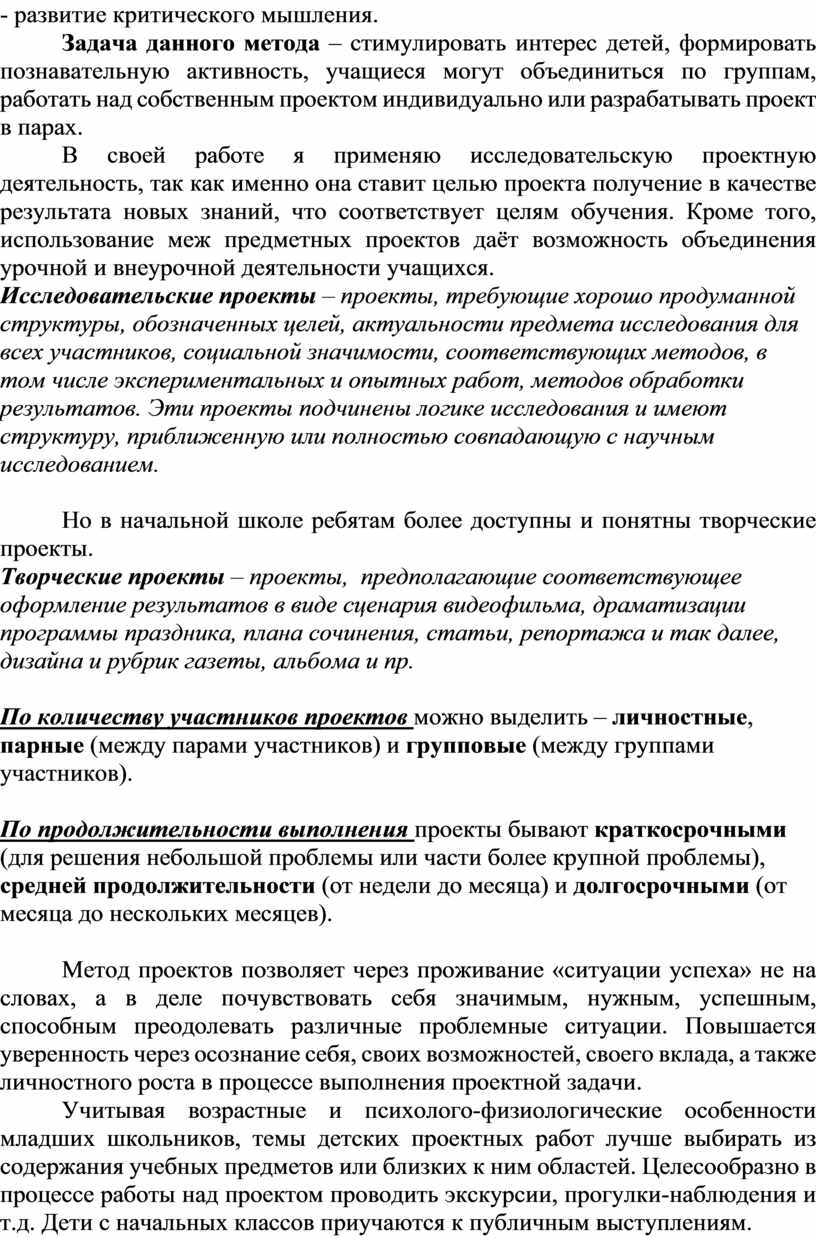 Используя проектную деятельность, мы вводим в свою работу метод проектов, который может быть эффективно использован, начиная с начальной школы, при этом, не заменяя традиционную систему, а органично дополняя, расширяя её.