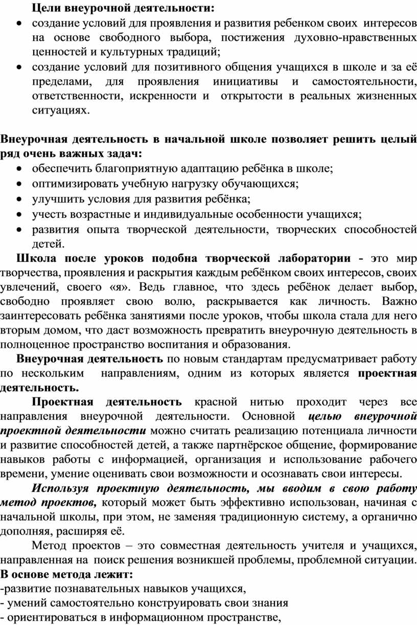 Проектная деятельность красной нитью проходит через все направления внеурочной деятельности. Основной целью внеурочной проектной деятельности можно считать реализацию потенциала личности и развитие способностей детей, а также партнёрское общение, формирование навыков работы с информацией, организация и использование рабочего времени, умение оценивать свои возможности и осознавать свои интересы.