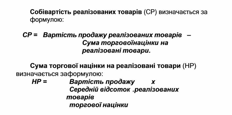 СР = Вартість продажу реалізованих товарів – Сума торгової націнки на реалізовані товари.
