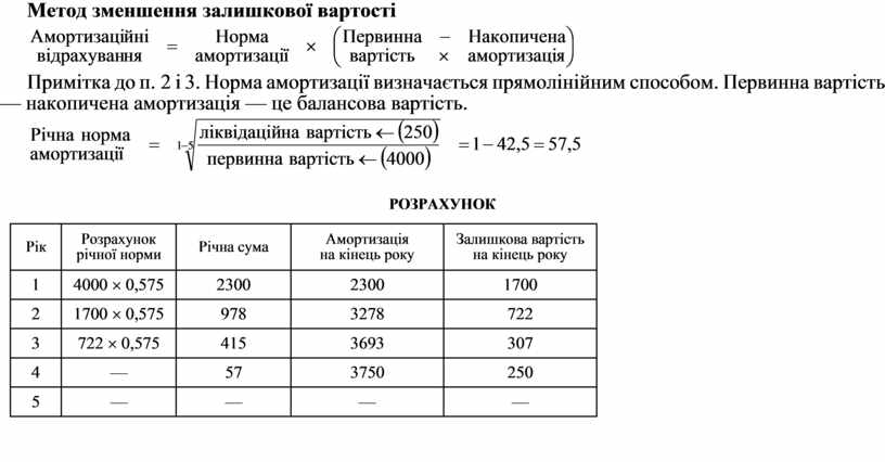 Примітка до п. 2 і 3. Норма амортизації визначається прямолінійним способом. Первинна вартість — накопичена амортизація — це балансова вартість.
