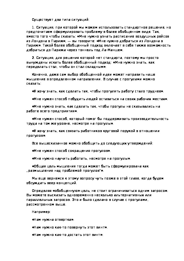 Ранее в этой книге при описании основных мыслительных процессов я неоднократно подчеркивал важность умения работать на самом обобщенном, широком и размытом уровне. Именно такой подход и будет рассматриваться в этом разделе. Опытные мыслители постоянно используют этот прием. Я пойду еще дальше и скажу, что есть люди, которые делают это интуитивно. Тому имеется две причины: их природные способности мыслить «в общем» и их способности к «планированию».