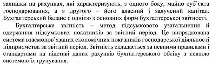 залишки на рахунках, які характеризують, з одного боку, майно суб’єкта господарювання, а з другого – його власний і залучений капітал. Бухгалтерський баланс є однією з основних форм бухгалтерської звітності.