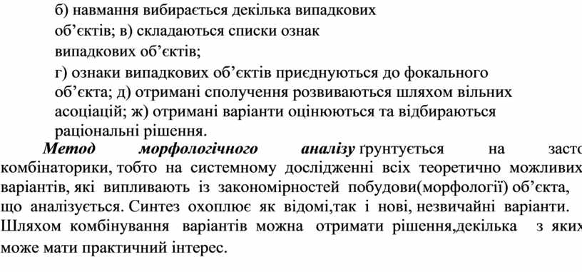 г) ознаки випадкових об’єктів приєднуються до фокального об’єкта; д) отримані сполучення розвиваються шляхом вільних асоціацій; ж) отримані варіанти оцінюються та відбираються раціональні рішення.