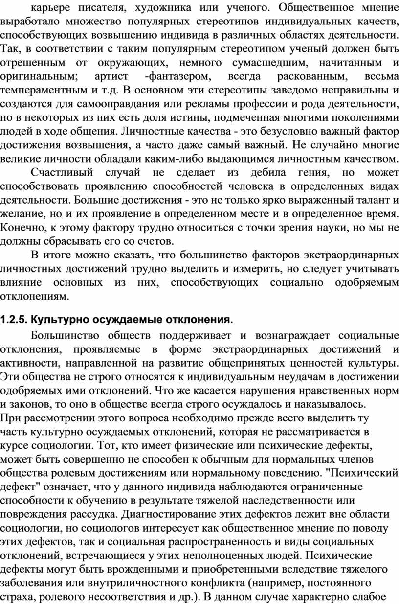Отклоняющееся поведение всегда оценивается с точки зрения культуры, принятой в данном обществе. Эта оценка заключается в том, что одни отклонения осуждаются, а другие одобряются. Например, странствующий монах в одном обществе может считаться святым, в другом - никчемным бездельником. В нашем обществе люди, попадающие под определение гения, героя, лидера, избранника народа - это культурно одобряемые отклонения. Такие отклонения связаны с понятием возвеличивания, т.е. возвышения над другими, что и составляет основу отклонения. Каждый из нас имеет свои представления о понятии возвеличивания. То же можно сказать и о групповых представлениях. Кроме того, ранжирование великих людей со временем меняется. Например, когда появляется потребность в защите общества, на первое место по значимости выходят гениальные полководцы, в другое время самыми великими могут стать политические деятели, деятели культуры, ученые. Попытаемся выделить необходимые качества и способы поведения, которые могут привести к социально одобряемым отклонениям.