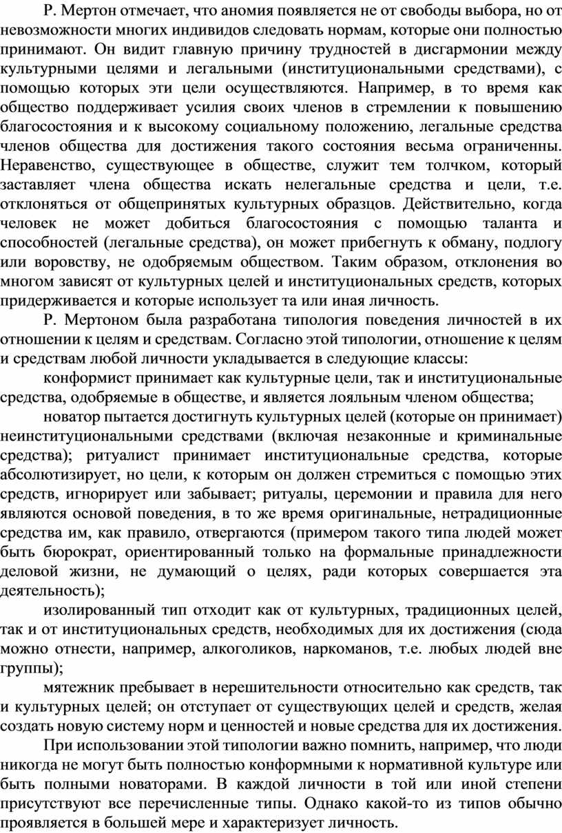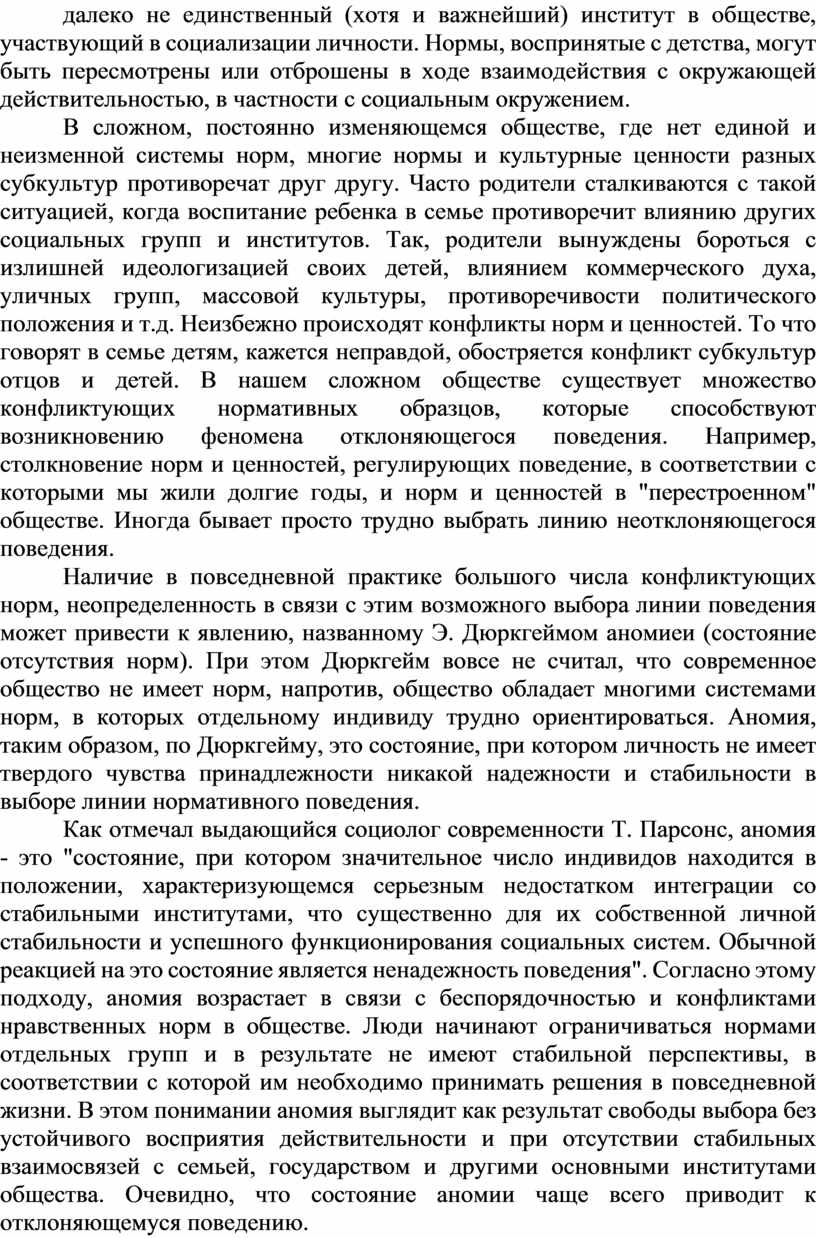 К величайшему сожалению, не существует такого счастливого общества, в котором все его члены вели бы себя в соответствии с общими нормативными требованиями. Термин "социальное отклонение" обозначает поведение индивида или группы, которое не соответствует общепринятым нормам, в результате чего эти нормы ими нарушаются. Социальные отклонения могут принимать самые разные формы. Преступники из молодежной среды, отшельники, аскеты, закоренелые грешники, святые, гении, художники-новаторы, убийцы - все это люди, отклоняющиеся от общепринятых норм, или, как их еще называют, девианты. В простых обществах с небольшим числом членов и несложной структурой норм отклоняющееся поведение легко определяется и контролируется. В обществах со сложной структурой часто противоречивых социальных норм проблема отклонений от общепринятого поведения вырастает до весьма значительных размеров.