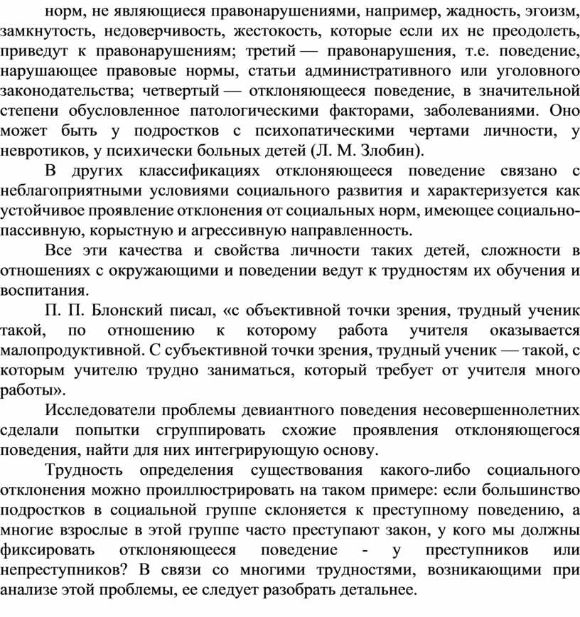 Девиантное поведение определяется как отклоняющееся поведение, т.е. как отдельные поступки или система поступков, противоречащих общепринятым в обществе правовым и нравственным нормам. В психолого-педагогической литературе существует и дифференцированный подход к характеристике самого отклоняющегося поведения. Так выделяют четыре варианта отклоняющегося поведения: первый — отклонения, не являющиеся нарушением общепринятых этических норм. Это может быть поведение, не соответствующее возрасту при нормальном психическом развитии (подросток любит играть с игрушками); второй — нарушения общепринятых норм, не являющиеся правонарушениями, например, жадность, эгоизм, замкнутость, недоверчивость, жестокость, которые если их не преодолеть, приведут к правонарушениям; третий — правонарушения, т.е. поведение, нарушающее правовые нормы, статьи административного или уголовного законодательства; четвертый — отклоняющееся поведение, в значительной степени обусловленное патологическими факторами, заболеваниями. Оно может быть у подростков с психопатическими чертами личности, у невротиков, у психически больных детей (Л. М. Злобин).