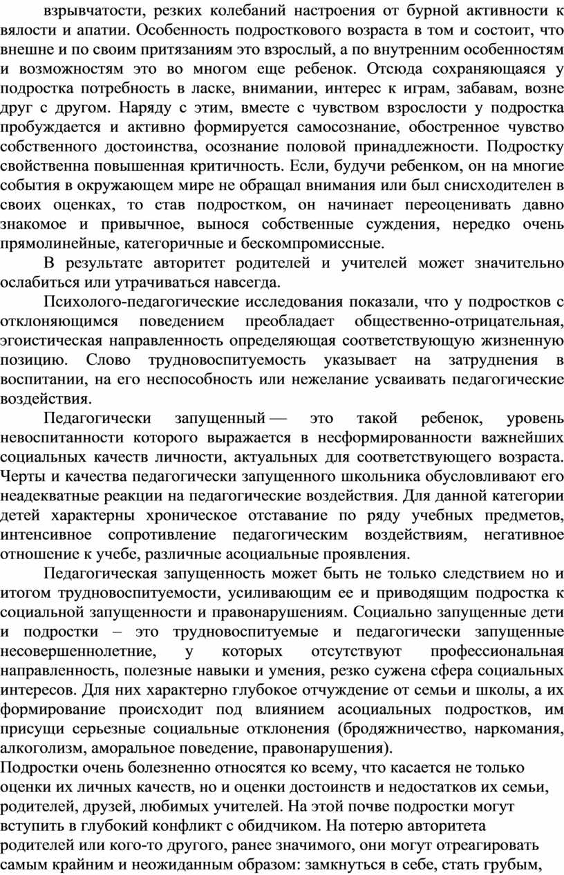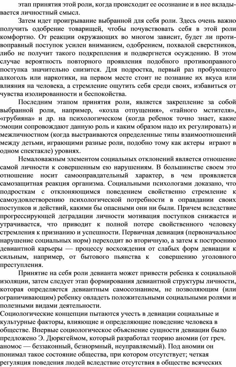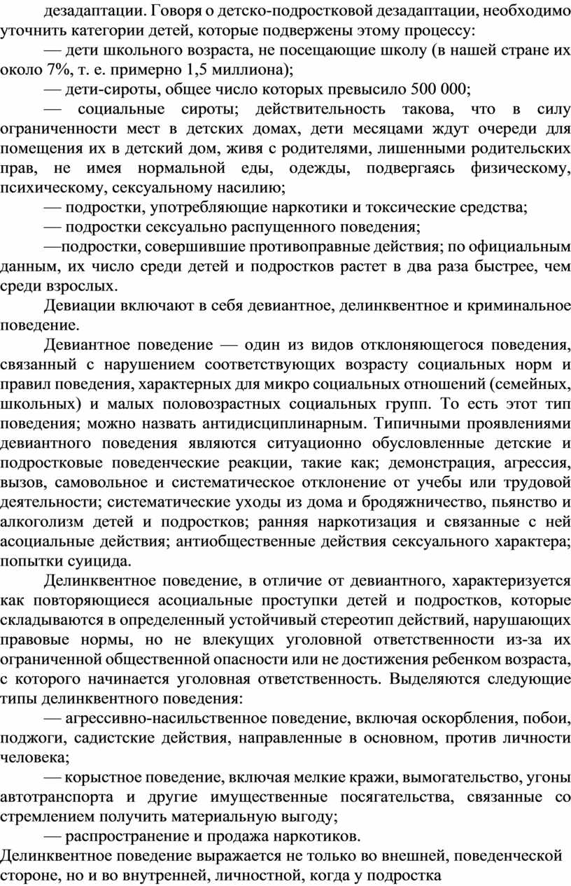 В подростковом возрасте серьезно изменяются условия жизни и деятельности подростка, что, в свою очередь, приводит к перестройке психики, появлению новых форм взаимодействия между сверстниками. У подростка меняется общественный статус, позиция, положение в коллективе, ему начинают предъявляться более серьезные требования со стороны взрослых. Девиантное поведение подразделяется на две большие категории. Во-первых это поведение, отклоняющееся от норм психического здоровья подразумевающее наличие явной или скрытой психопатологии. Во-вторых, это антисоциальное поведение, нарушающее какие-то социальные и культурные нормы, особенно правовые. Антисоциальное или асоциальное поведение различается как по содержанию и целевой направленности, так и по степени общественной опасности и может проявляться в различных социальных отклонениях, от нарушения морали, незначительных правонарушений до тяжких преступлений. Асоциальные проявления выражаются не только во внешней, поведенческой стороне, к нарушению социальных норм и развитию асоциального поведения ведет деформация ценностных ориентации и ценностно-нормативных представлений, то есть деформация системы внутренней регуляции.