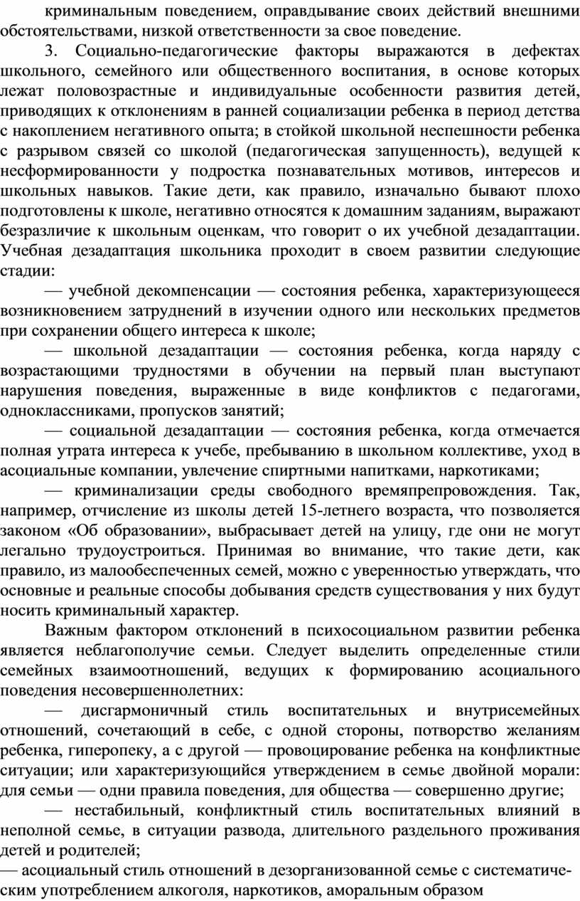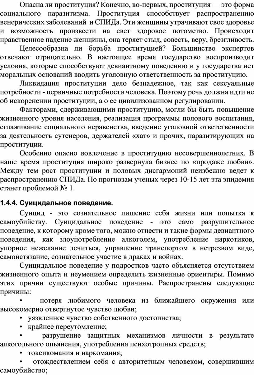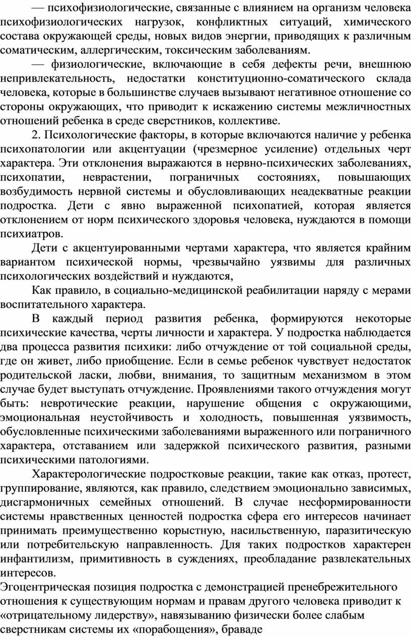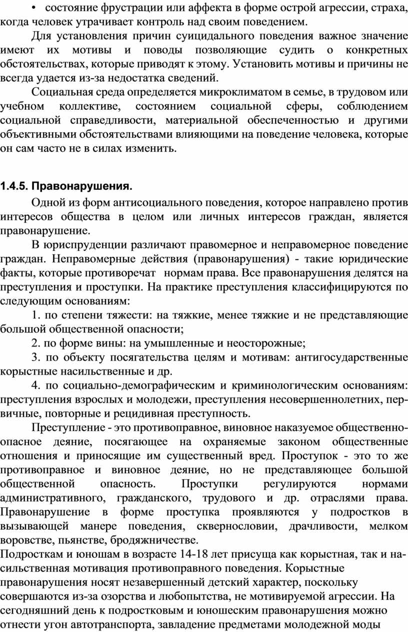 В подростковом возрасте серьезно изменяются условия жизни и деятельности подростка, что, в свою очередь, приводит к перестройке психики, появлению новых форм взаимодействия между сверстниками. У подростка меняется общественный статус, позиция, положение в коллективе, ему начинают предъявляться более серьезные требования со стороны взрослых. Девиантное поведение подразделяется на две большие категории. Во-первых это поведение, отклоняющееся от норм психического здоровья подразумевающее наличие явной или скрытой психопатологии. Во-вторых, это антисоциальное поведение, нарушающее какие-то социальные и культурные нормы, особенно правовые. Антисоциальное или асоциальное поведение различается как по содержанию и целевой направленности, так и по степени общественной опасности и может проявляться в различных социальных отклонениях, от нарушения морали, незначительных правонарушений до тяжких преступлений. Асоциальные проявления выражаются не только во внешней, поведенческой стороне, к нарушению социальных норм и развитию асоциального поведения ведет деформация ценностных ориентации и ценностно-нормативных представлений, то есть деформация системы внутренней регуляции.