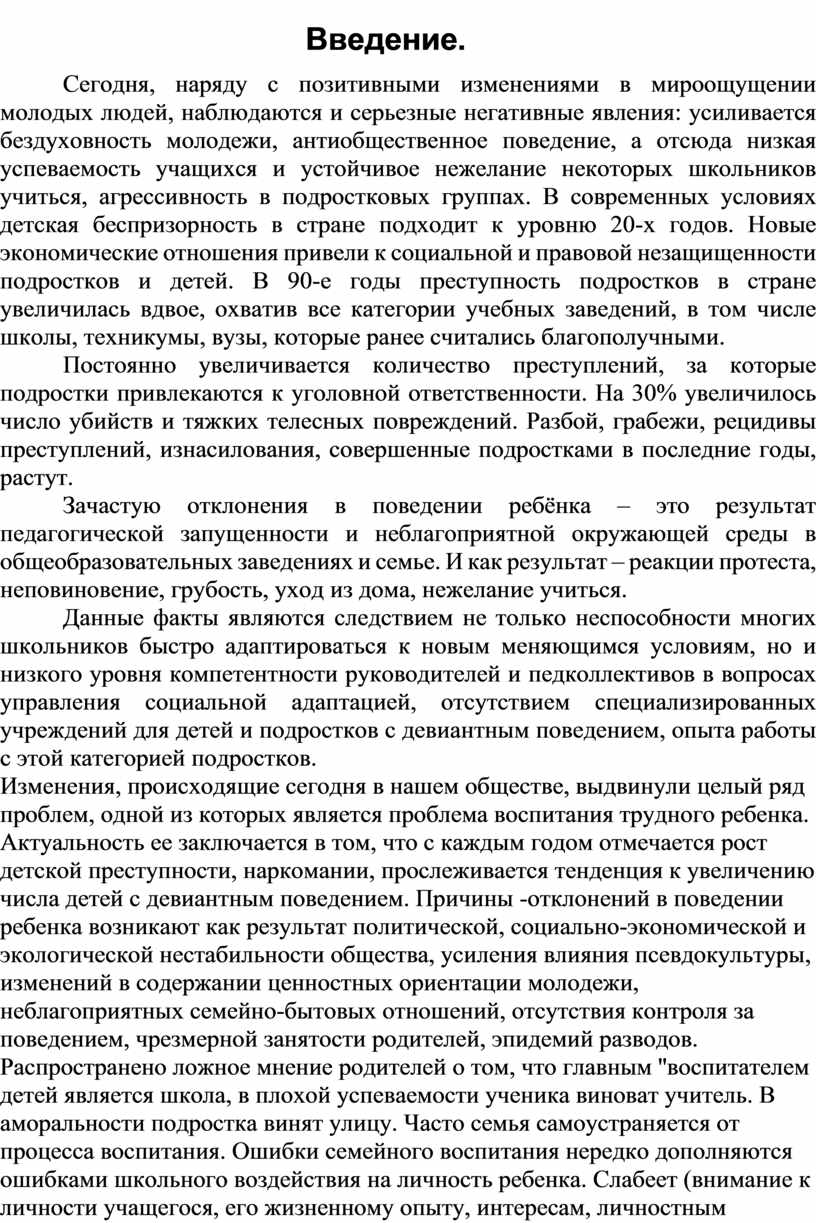 Изменения, происходящие сегодня в нашем обществе, выдвинули целый ряд проблем, одной из которых является проблема воспитания трудного ребенка. Актуальность ее заключается в том, что с каждым годом отмечается рост детской преступности, наркомании, прослеживается тенденция к увеличению числа детей с девиантным поведением. Причины -отклонений в поведении ребенка возникают как результат политической, социально-экономической и экологической нестабильности общества, усиления влияния псевдокультуры, изменений в содержании ценностных ориентации молодежи, неблагоприятных семейно-бытовых отношений, отсутствия контроля за поведением, чрезмерной занятости родителей, эпидемий разводов. Распространено ложное мнение родителей о том, что главным ''воспитателем детей является школа, в плохой успеваемости ученика виноват учитель. В аморальности подростка винят улицу. Часто семья самоустраняется от процесса воспитания. Ошибки семейного воспитания нередко дополняются ошибками школьного воздействия на личность ребенка. Слабеет (внимание к личности учащегося, его жизненному опыту, интересам, личностным ценностям, эмоциональной сфере. Внешкольное воспитание не предлагает бесплатного многообразия выбора видов деятельности, не гарантирует относительной независимости от взрослых, широких возможностей для развития активности и самодеятельности, неформального характера отношений, разновозрастного состава объединений.