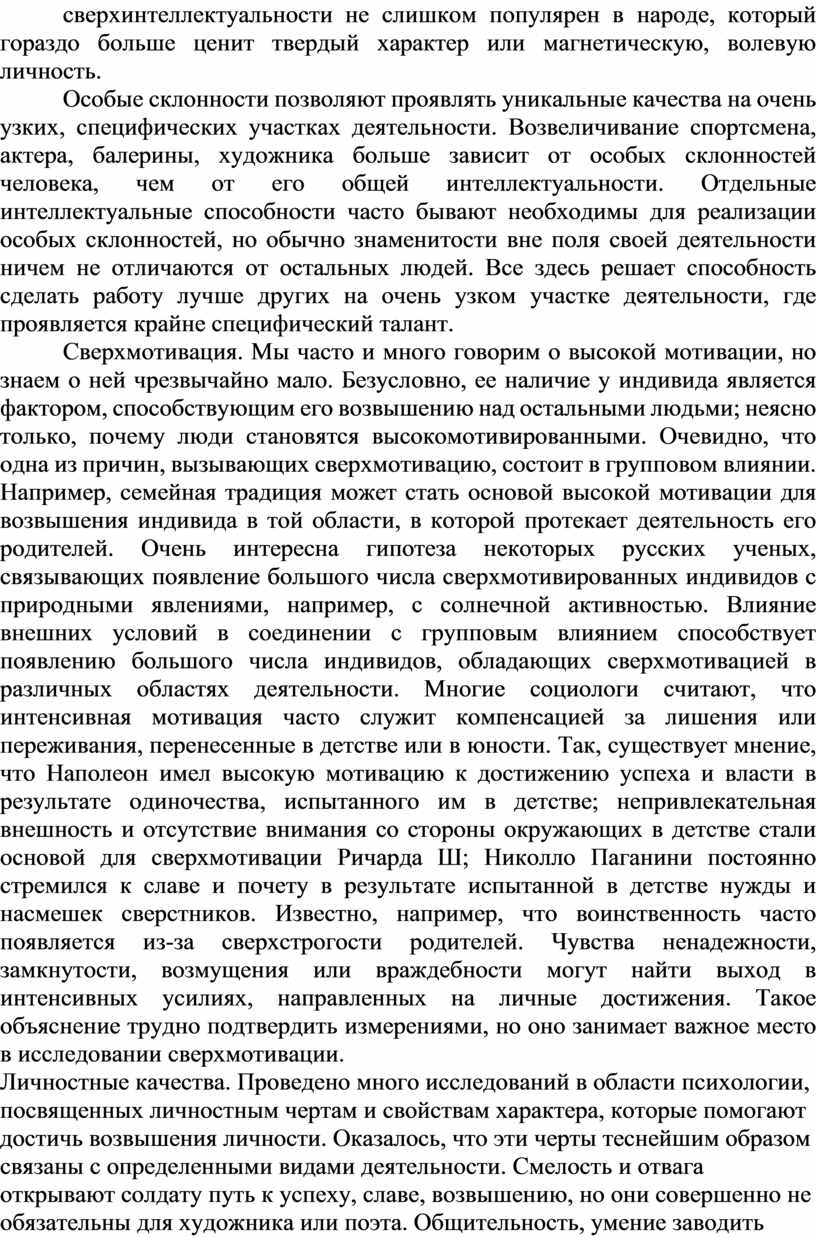 Сверхинтеллектуальность. Повышенная интеллектуальность может рассматриваться как способ поведения, приводящий к социально одобряемым отклонениям лишь при достижении ограниченного числа социальных статусов. Интеллектуальная посредственность невозможна при исполнении ролей крупного ученого или культурного деятеля, в то же время сверхинтеллектуальность менее необходима для актера, спортсмена или политического лидера. В этих ролях куда более важны специфический талант, физическая сила, сильный характер. Сверхинтеллектуальность может быть даже помехой при исполнении некоторых ролей, так как изолирует личность от остальных членов группы. Другими словами, возвеличивание на основе интеллектуальности возможно только в отдельных, строго ограниченных областях человеческой деятельности. Фактор сверхинтеллектуальности не слишком популярен в народе, который гораздо больше ценит твердый характер или магнетическую, волевую личность.