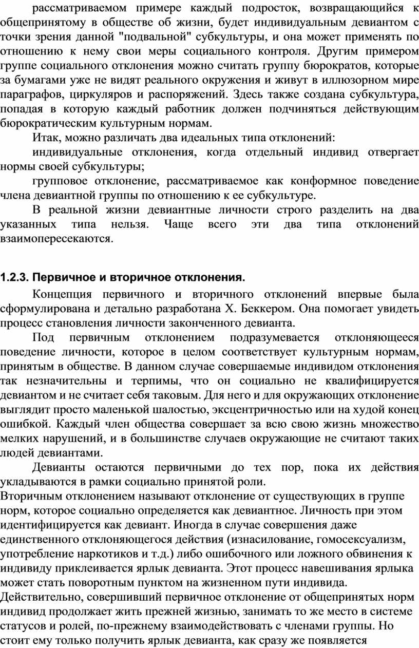 Концепция первичного и вторичного отклонений впервые была сформулирована и детально разработана X. Беккером. Она помогает увидеть процесс становления личности законченного девианта.