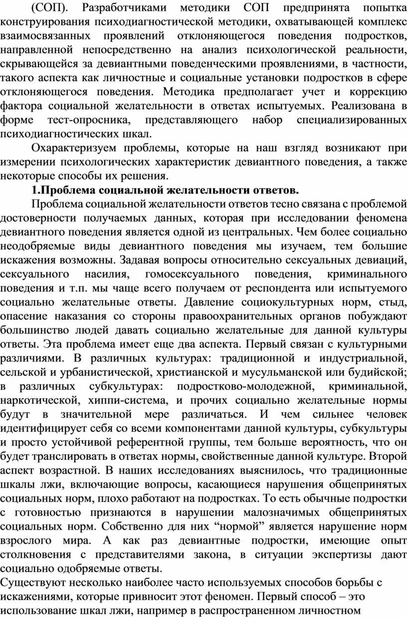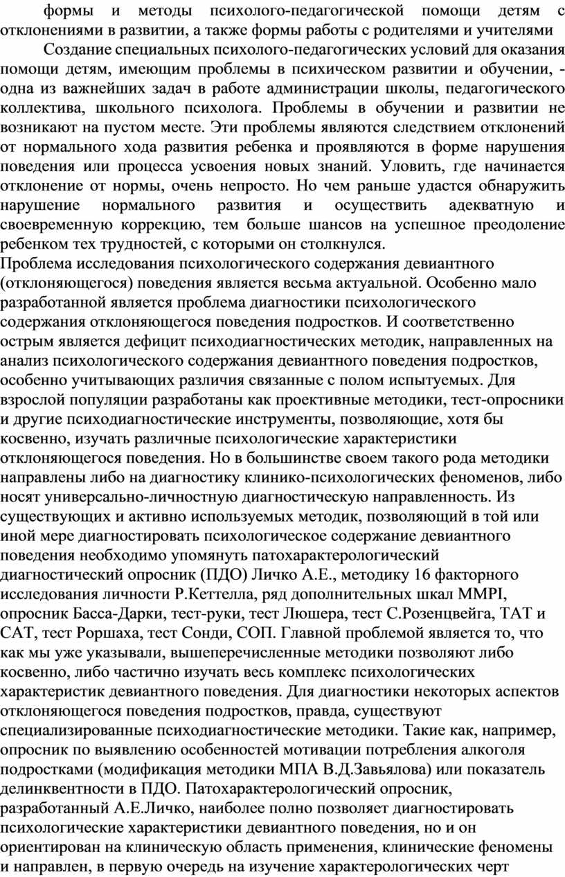 Проблема исследования психологического содержания девиантного (отклоняющегося) поведения является весьма актуальной. Особенно мало разработанной является проблема диагностики психологического содержания отклоняющегося поведения подростков. И соответственно острым является дефицит психодиагностических методик, направленных на анализ психологического содержания девиантного поведения подростков, особенно учитывающих различия связанные с полом испытуемых. Для взрослой популяции разработаны как проективные методики, тест-опросники и другие психодиагностические инструменты, позволяющие, хотя бы косвенно, изучать различные психологические характеристики отклоняющегося поведения. Но в большинстве своем такого рода методики направлены либо на диагностику клинико-психологических феноменов, либо носят универсально-личностную диагностическую направленность. Из существующих и активно используемых методик, позволяющий в той или иной мере диагностировать психологическое содержание девиантного поведения необходимо упомянуть патохарактерологический диагностический опросник (ПДО) Личко А.Е., методику 16 факторного исследования личности Р.Кеттелла, ряд дополнительных шкал MMPI, опросник Басса-Дарки, тест-руки, тест Люшера, тест С.Розенцвейга, ТАТ и САТ, тест Роршаха, тест Сонди, СОП. Главной проблемой является то, что как мы уже указывали, вышеперечисленные методики позволяют либо косвенно, либо частично изучать весь комплекс психологических характеристик девиантного поведения. Для диагностики некоторых аспектов отклоняющегося поведения подростков, правда, существуют специализированные психодиагностические методики. Такие как, например, опросник по выявлению особенностей мотивации потребления алкоголя подростками (модификация методики МПА В.Д.Завьялова) или показатель делинквентности в ПДО. Патохарактерологический опросник, разработанный А.Е.Личко, наиболее полно позволяет диагностировать психологические характеристики девиантного поведения, но и он ориентирован на клиническую область применения, клинические феномены и направлен, в первую очередь на изучение характерологических черт личности, а не непосредственно той психологической реальности, которая стоит за феноменом отклоняющегося поведения. Кроме того, по ряду психометрических характеристик он не соответствует требованиям, предъявляемым к психодиагностическим методикам этого класса в настоящее время и не является тест-опросником в строгом смысле этого слова.