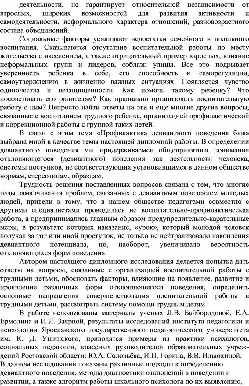 Автором настоящего дипломного исследования делается попытка дать ответы на вопросы, связанные с организацией воспитательной работы с трудными детьми, обосновать факторы, влияющие на появление, развитие и проявление различных форм отклоняющегося поведения, определить основные направления совершенствования воспитательной работы с трудными детьми, рассмотреть систему помощи трудным детям.