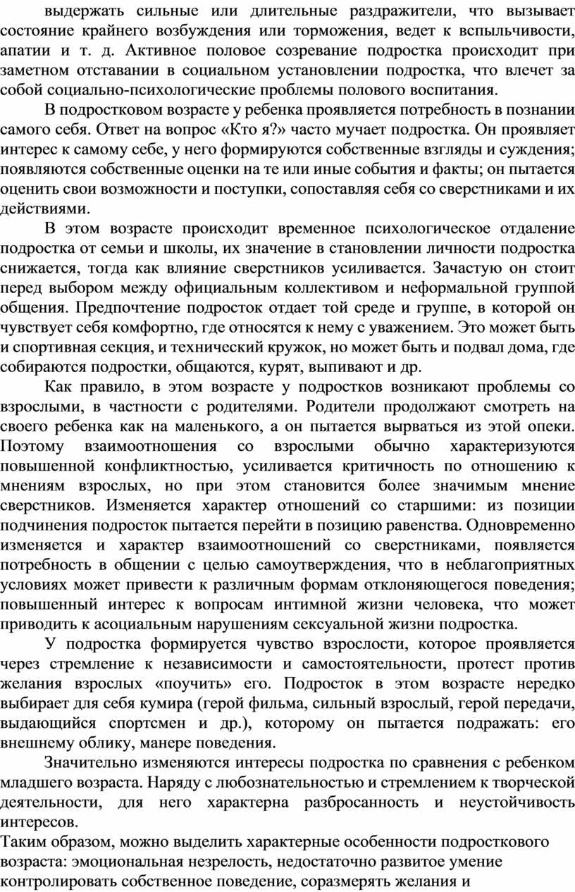Подростковый возраст — самый трудный и сложный из всех детских возрастов. Его еще называют переходным возрастом, потому что в течение этого периода происходит своеобразный переход от детства к взрослости, от незрелости к зрелости, который пронизывает все стороны развития подростка: анатомо-физиологическое строение, интеллектуальное, нравственное развитие, а также разнообразные виды его деятельности.