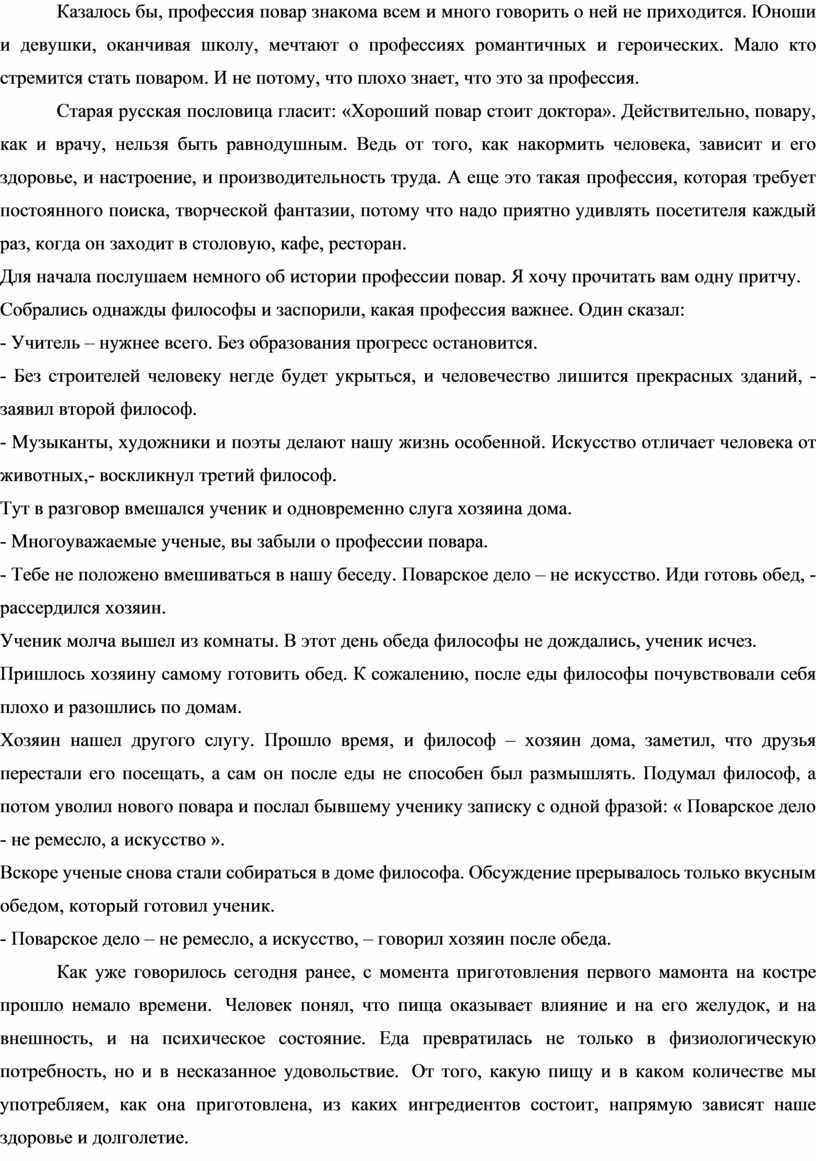Для начала послушаем немного об истории профессии повар. Я хочу прочитать вам одну притчу.