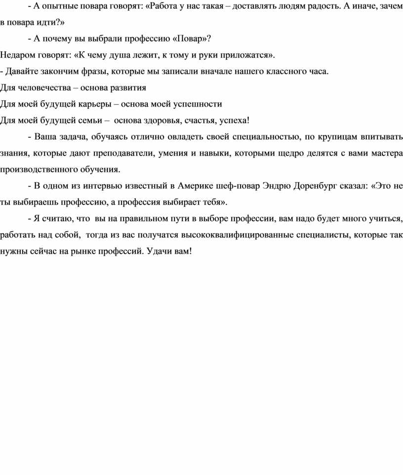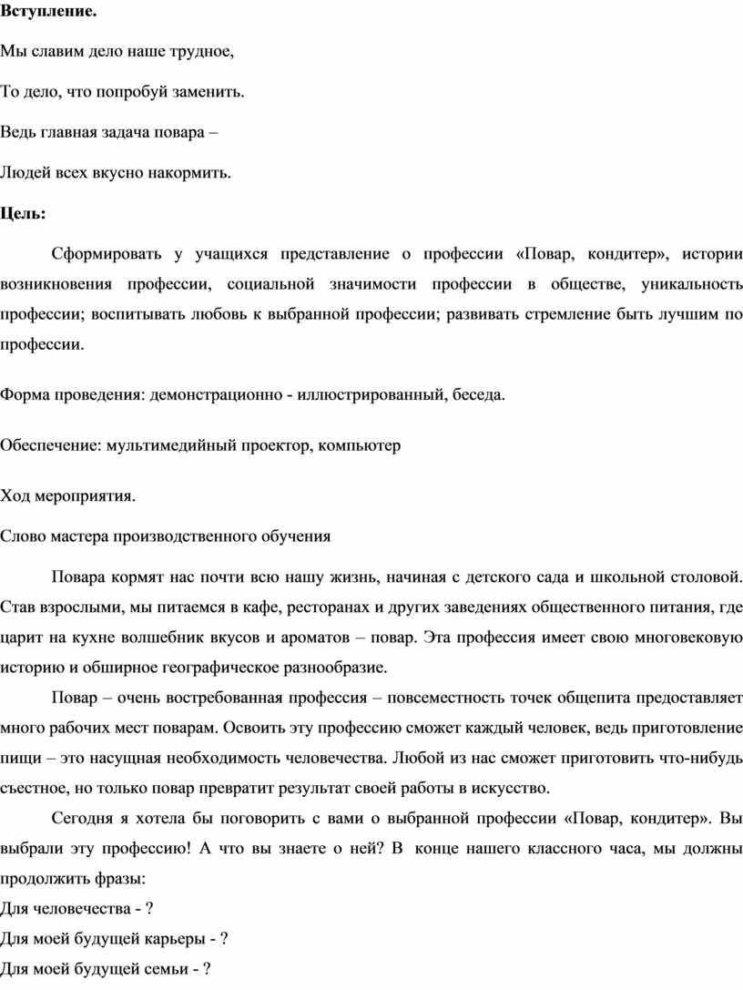 Сегодня я хотела бы поговорить с вами о выбранной профессии «Повар, кондитер». Вы выбрали эту профессию! А что вы знаете о ней? В конце нашего классного часа, мы должны продолжить фразы: