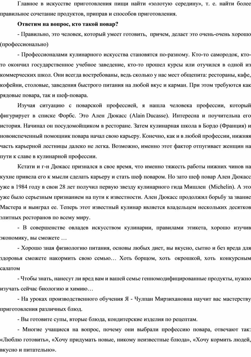 Казалось бы, профессия повар знакома всем и много говорить о ней не приходится. Юноши и девушки, оканчивая школу, мечтают о профессиях романтичных и героических. Мало кто стремится стать поваром. И не потому, что плохо знает, что это за профессия.