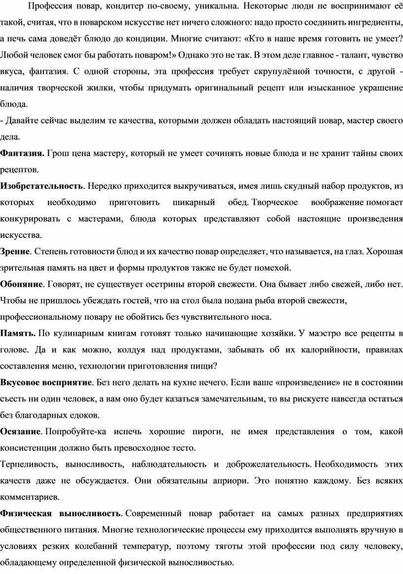Физическая выносливость. Современный повар работает на самых разных предприятиях общественного питания. Многие технологические процессы ему приходится выполнять вручную в условиях резких колебаний температур, поэтому тяготы этой профессии под силу человеку, обладающему определенной физической выносливостью.