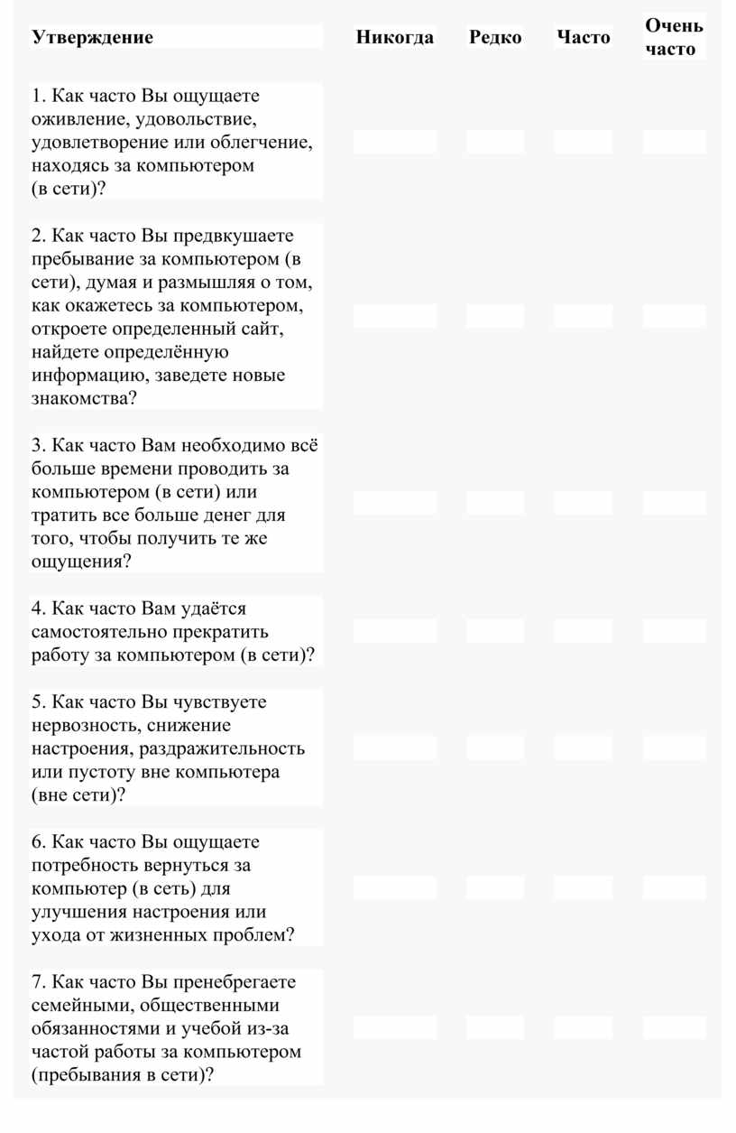 Опросник состоит из 11 утверждений относительно проявлений эмоционального состояния личности за компьютером или в Интернете, рассуждений относительно реализации замыслов и предчувствия удовольствия, количества времени пребывания за компьютером и материальных расходов, связанных с этим, волевых свойств, ощущений, получаемых во время провождения компьютерного досуга, ассоциативного характера восприятия получаемого удовольствия, влияния увлечения компьютером на социально-бытовые обязанности, роли социальных обязательств в повседневном быте, влияния компьютера на психофизическое состояние, режим сна и бодрствования.