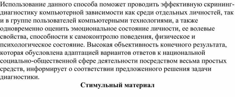 Использование данного способа поможет проводить эффективную скрининг-диагностику компьютерной зависимости как среди отдельных личностей, так и в группе пользователей компьютерными технологиями, а также одновременно оценить эмоциональное состояние личности, ее волевые свойства, способности к самоконтролю поведения, физическое и психологическое состояние. Высокая объективность конечного результата, которая обусловлена адаптацией вариантов ответов к национальной социально-общественной сфере деятельности посредством весьма простых средств, информирует о соответствии предложенного решения задачи диагностики.