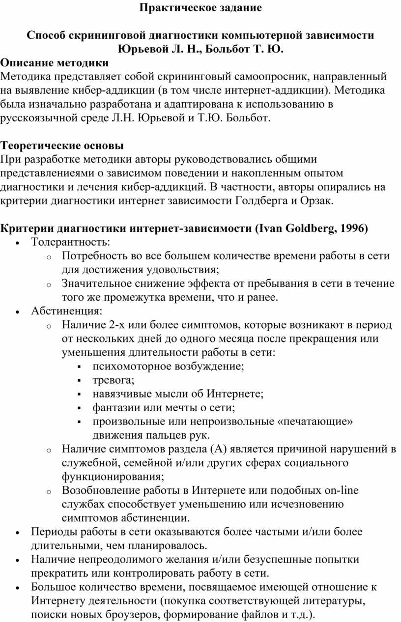 Способ скрининговой диагностики компьютерной зависимости Юрьевой Л. Н., Больбот Т. Ю.