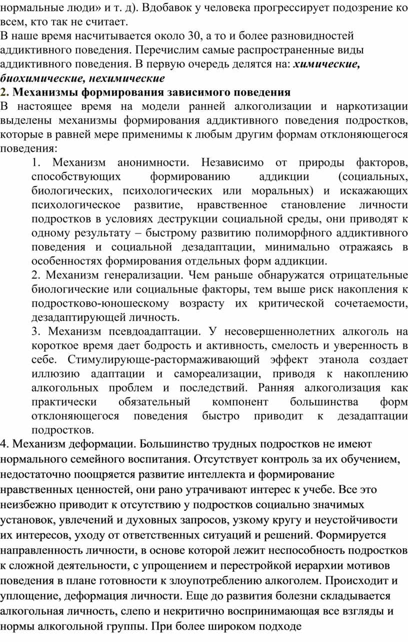 В настоящее время на модели ранней алкоголизации и наркотизации выделены механизмы формирования аддиктивного поведения подростков, которые в равней мере применимы к любым другим формам отклоняющегося поведения: