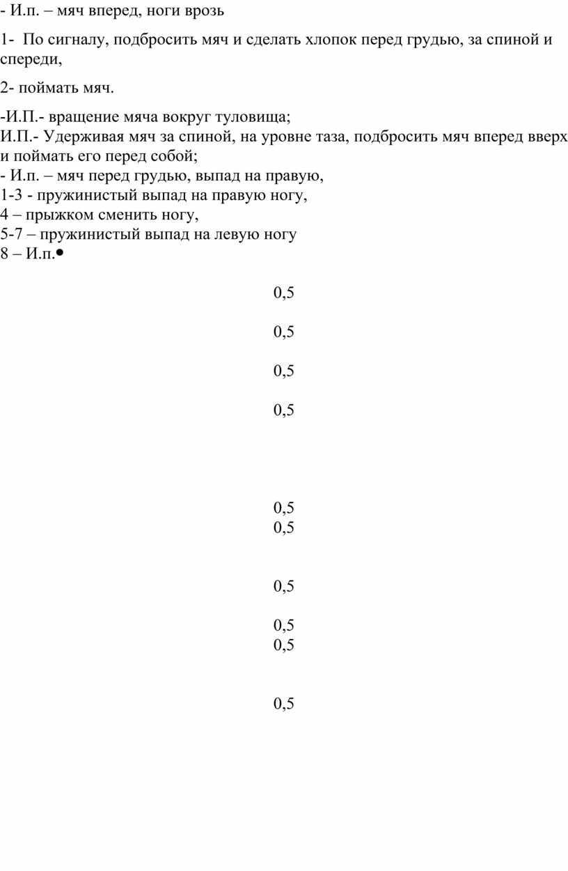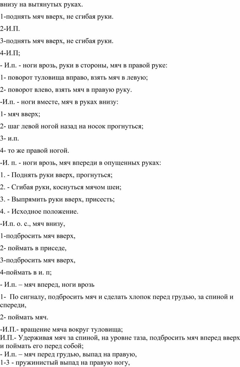 Упражнения в ходьбе: 1. Ходьба на носках, руки на пояс.-Марш; 2. Ходьба на пятках, руки на плечи-марш!; 3 Перекаты с пятки на носок, руки на пояс -марш! 4 Наклон на каждый шаг- марш! Команда: «чаще шаг, бегом марш!» Упражнения в беге: - бег по кругу - бег приставными шагами (правым и левым), в стойке баскетболиста - бег спиной вперед, смотрим через левое плечо - бег с подниманием бедра - бег захлёст голени Команда «Реже шаг! Шагом марш!» -ходьба с восстановлением дыхания по кругу Налево в колонну по два! Марш!» Команда: «Вправо-влево на вытянутые в стороны руки приставными шагами разомкнись!» Организует перестроение в колонну по два и выполнение специальной разминки. ОРУ на месте с мячом: - И.П. Стойка «ноги врозь», мяч находится внизу на вытянутых руках. 1-наклон головы вперед; 2-наклон головы назад; 3-наклон головы вправо; 4-наклон головы влево; - И.П. основная стойка, мяч внизу на вытянутых руках. 1-поднять мяч вверх, не сгибая руки. 2-И.П. 3-поднять мяч вверх, не сгибая руки. 4-И.П; - И.п. - ноги врозь, руки в стороны, мяч в правой руке: 1- поворот туловища вправо, взять мяч в левую; 2- поворот влево, взять мяч в правую руку. -И.п. - ноги вместе, мяч в руках внизу: 1- мяч вверх; 2- шаг левой ногой назад на носок прогнуться; 3- и.п. 4- то же правой ногой. -И. п. - ноги врозь, мяч впереди в опущенных руках: 1. - Поднять руки вверх, прогнуться; 2. - Сгибая руки, коснуться мячом шеи; 3. - Выпрямить руки вверх, присесть; 4. - Исходное положение. -И.п. о. с., мяч внизу, 1-подбросить мяч вверх, 2- поймать в приседе, 3-подбросить мяч вверх, 4-поймать в и. п; - И.п. – мяч вперед, ноги врозь 1- По сигналу, подбросить мяч и сделать хлопок перед грудью, за спиной и спереди, 2- поймать мяч. -И.П.- вращение мяча вокруг туловища; И.П.- Удерживая мяч за спиной, на уровне таза, подбросить мяч вперед вверх и поймать его перед собой; - И.п. – мяч перед грудью, выпад на правую, 1-3 - пружинистый выпад на правую ногу, 4 – прыжком сменить ногу, 5-7 – пружинистый выпад на левую ногу 8 – И.п. |