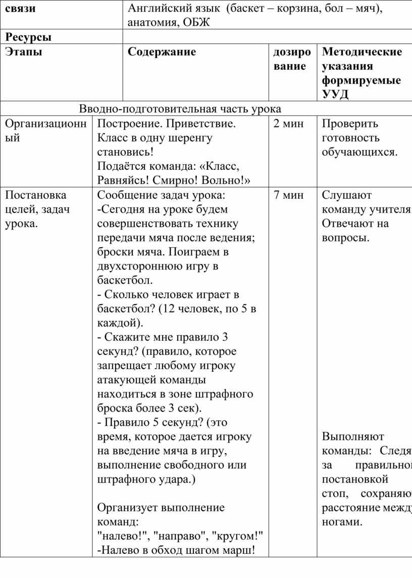 Регулятивные УУД: 1.Формировать умения адекватно оценивать собственное поведение и поведение окружающих. 2.Развивать умения выделять и формулировать то, что усвоено и, что нужно усвоить, определять качество и уровень усвоения знаний. Коммуникативные УУД: Формировать собственное мнение и позицию, договариваться, приходить к общему решению в совместной деятельности Познавательные УУД: 1. Совершенствовать технику передачи мяча после ведения; элементы бросков. 2. Закреплять изученные действия в игре «Баскетбол». Личностные УУД: 1.Формировать самостоятельность и личную ответственность за свои поступки, установка на здоровый образ жизни. 2.Формировать навыки сотрудничества в разных ситуациях, умение не создавать конфликты и находить выходы из спорных ситуаций. |