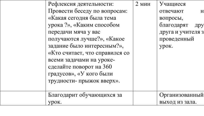 Рефлексия деятельности: Провести беседу по вопросам: «Какая сегодня была тема урока ?», «Каким способом передачи мяча у вас получаются лучше?», «Какое задание было интересным?», «Кто считает, что справился со всеми задачами на уроке- сделайте поворот на 360 градусов», «У кого были трудности- прыжок вверх».